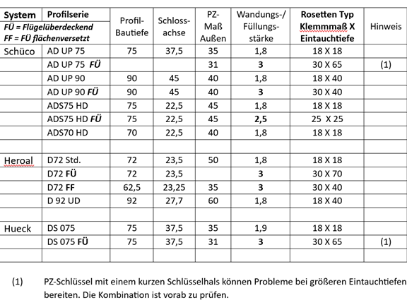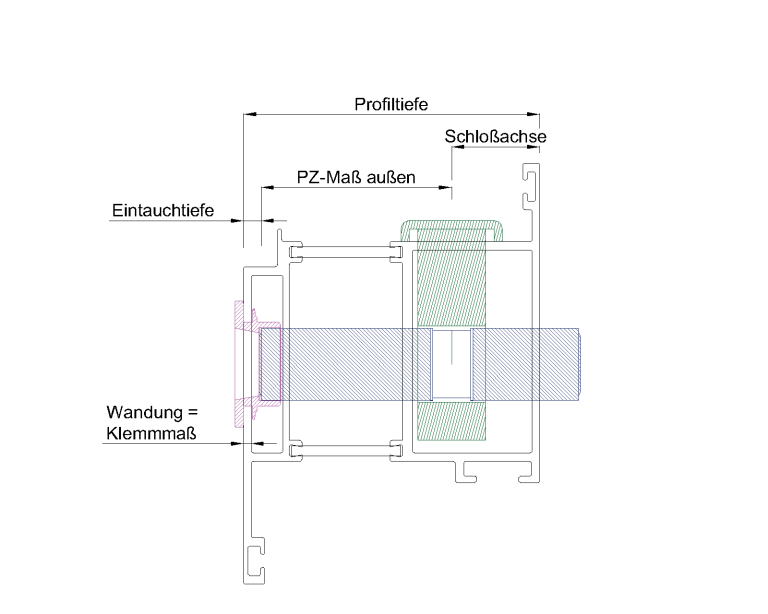 Eintauchtiefe der Rosette in das Profil zur bündigen Ausrichtung mit dem Profilzylinder; maßgeblich sind Profiltiefe, Position der Schlossachse und Außenmaß des Profilzylinders.